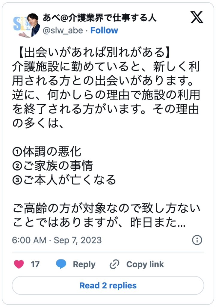 このポストを書いた背景には、「利用者様とのお別れが続いた経験」がありました。