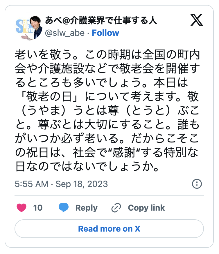 このポストを書いたのは、介護の現場に立つ中で「敬老の日」という祝日の意味を改めて考える機会があったからです。