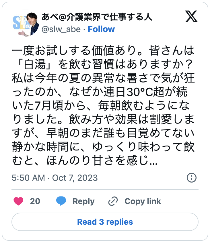 一度お試しする価値あり。皆さんは「白湯」を飲む習慣はありますか?私は今年の夏の異常な暑さで気が狂ったのか、なぜか連日30℃超が続いた7月頃から、毎朝飲むようになりました。飲み方や効果は割愛しますが、早朝のまだ誰も目覚めてない静かな時間に、ゆっくり味わって飲むと、ほんのり甘さを感じ…
